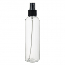 Transparente PET-Flasche mit Sprüher für Isopropylalkohol mit Volumen von 250 ml. Parameter: Neck Größe: 24/410 Volumen: 250ml Farbe: Schwarz / Transparent Material: PET Flaschenneck-Typ: Anschrauben (Screw on) Forme: Zylindrische Gewicht: 31,70 g
